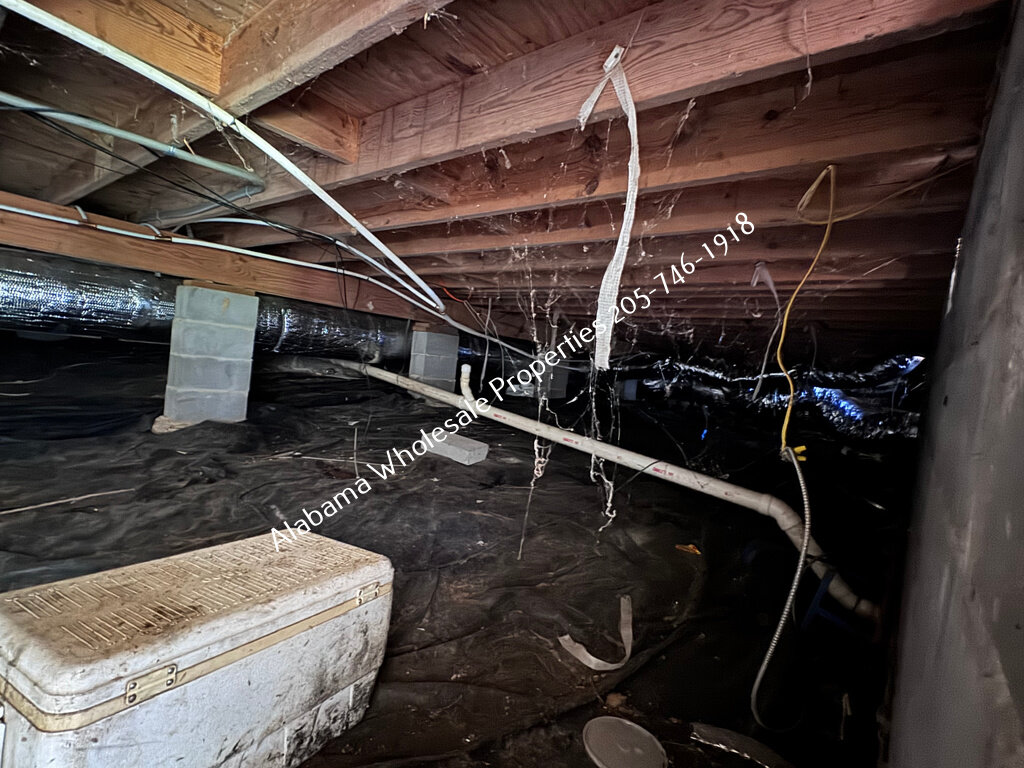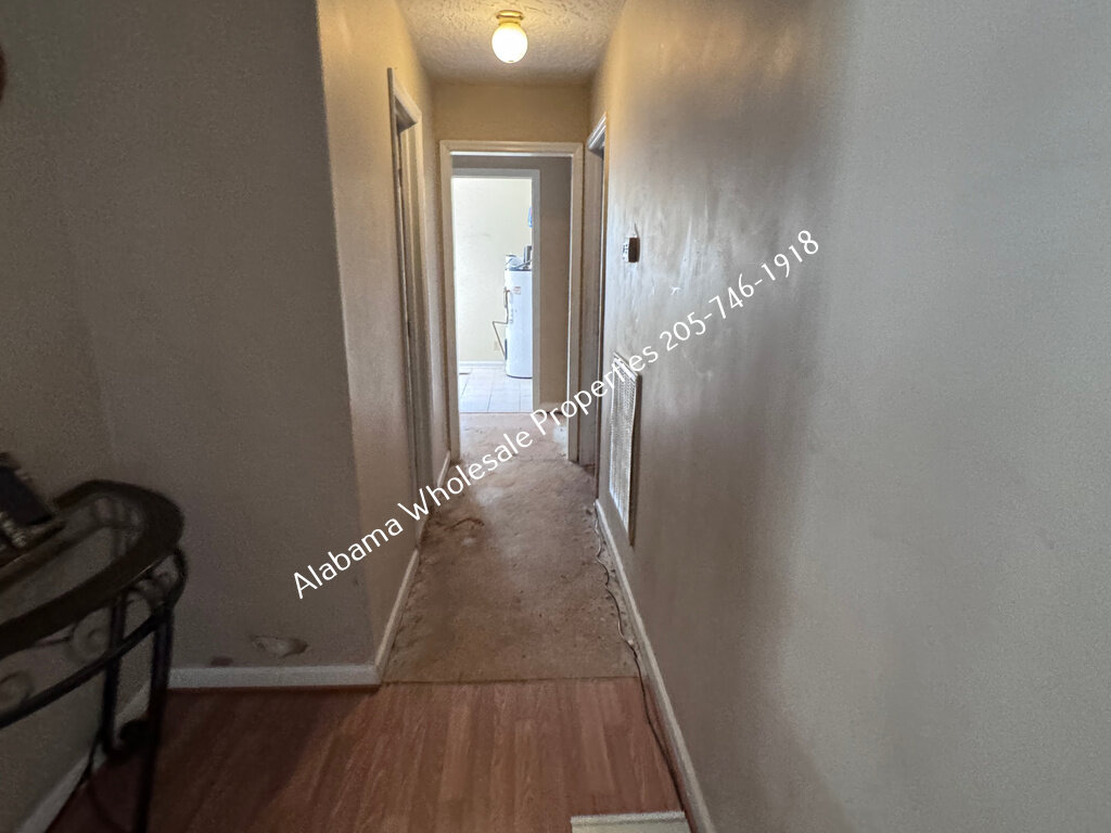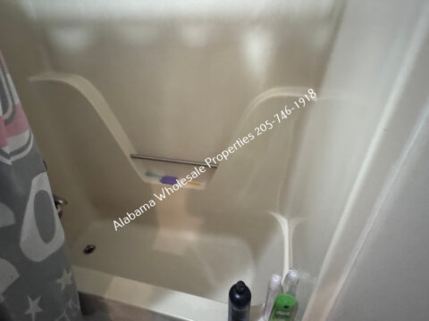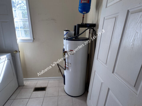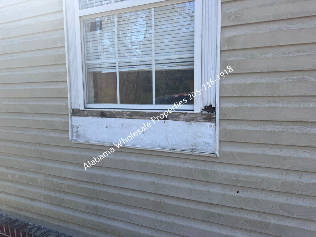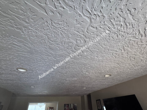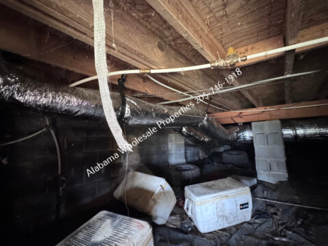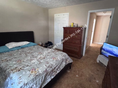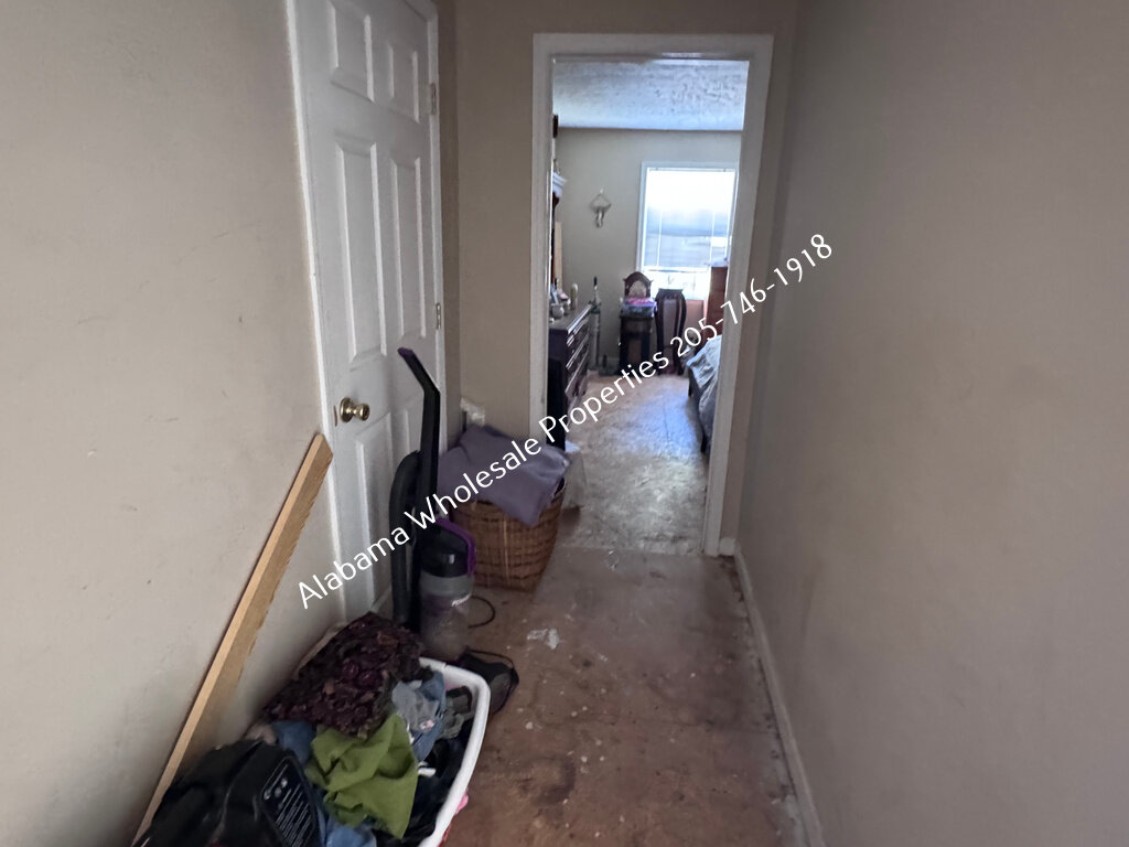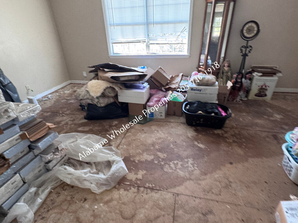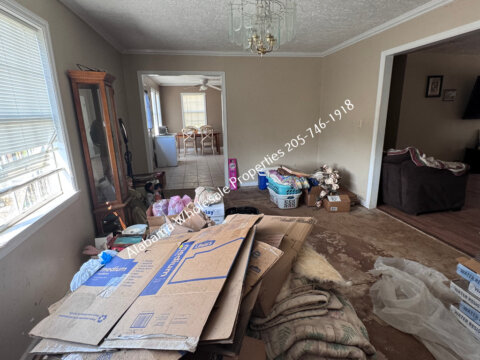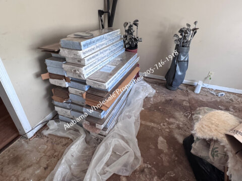 The home will need interior paint and flooring throughout. There is a stack of flooring material on-site, though it’s unclear if it’s enough to complete the entire house. Some subfloor repairs will be necessary. Bathrooms need updating, and the kitchen will require appliances and cabinet painting.