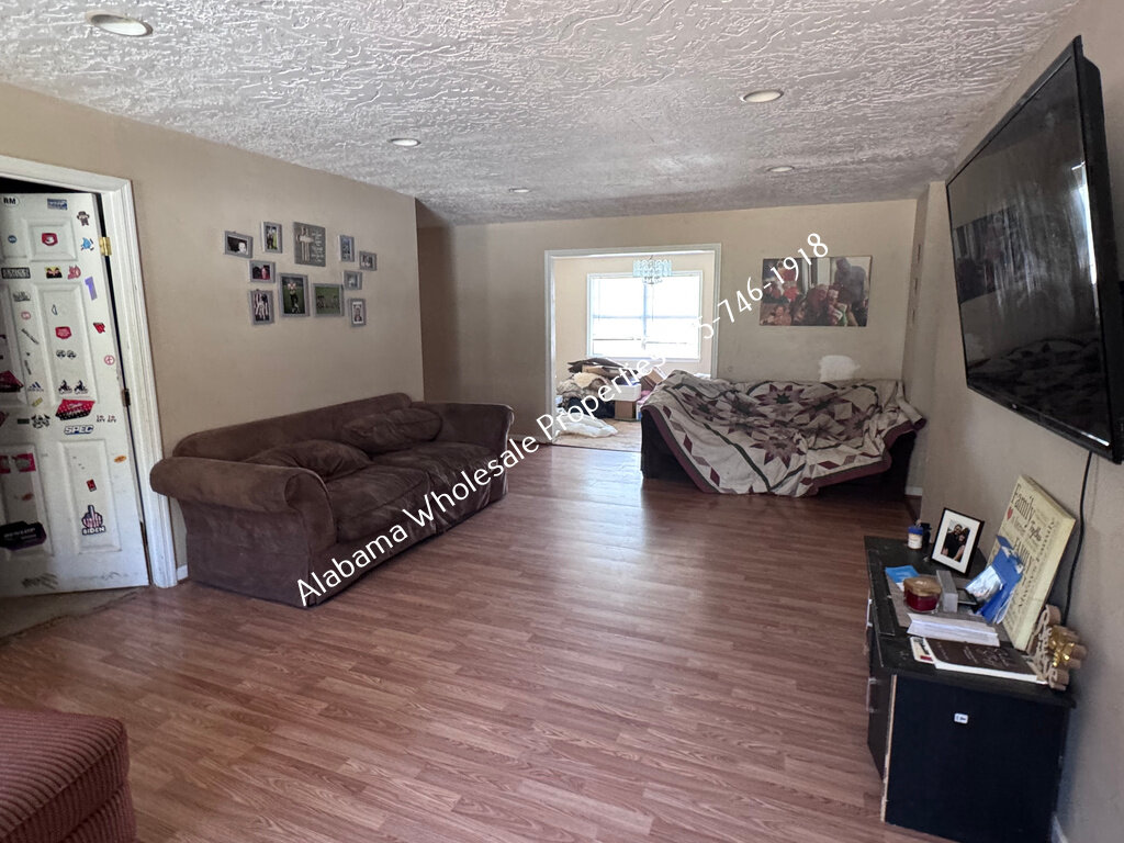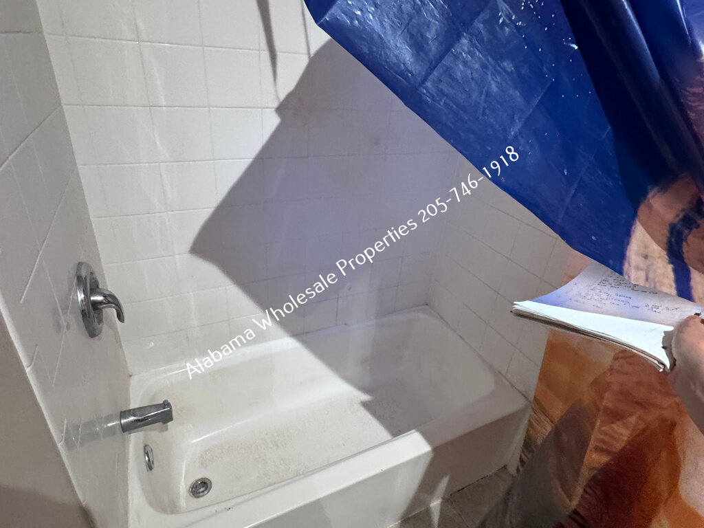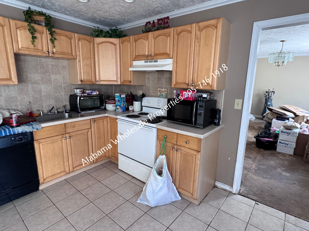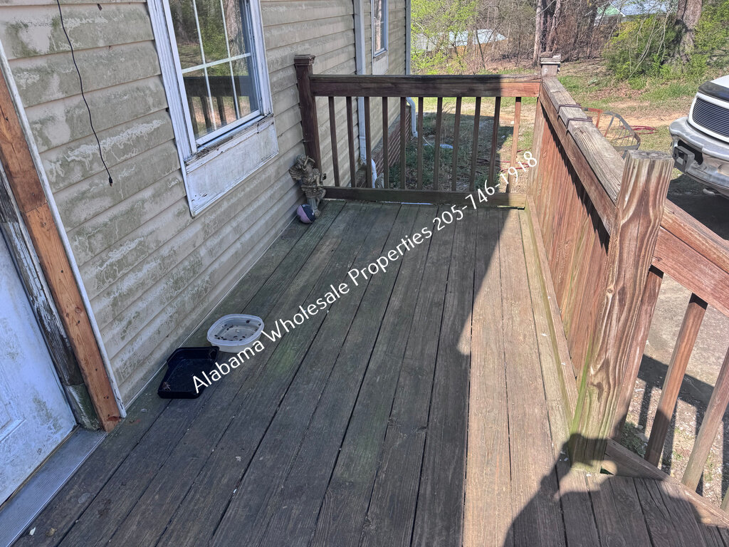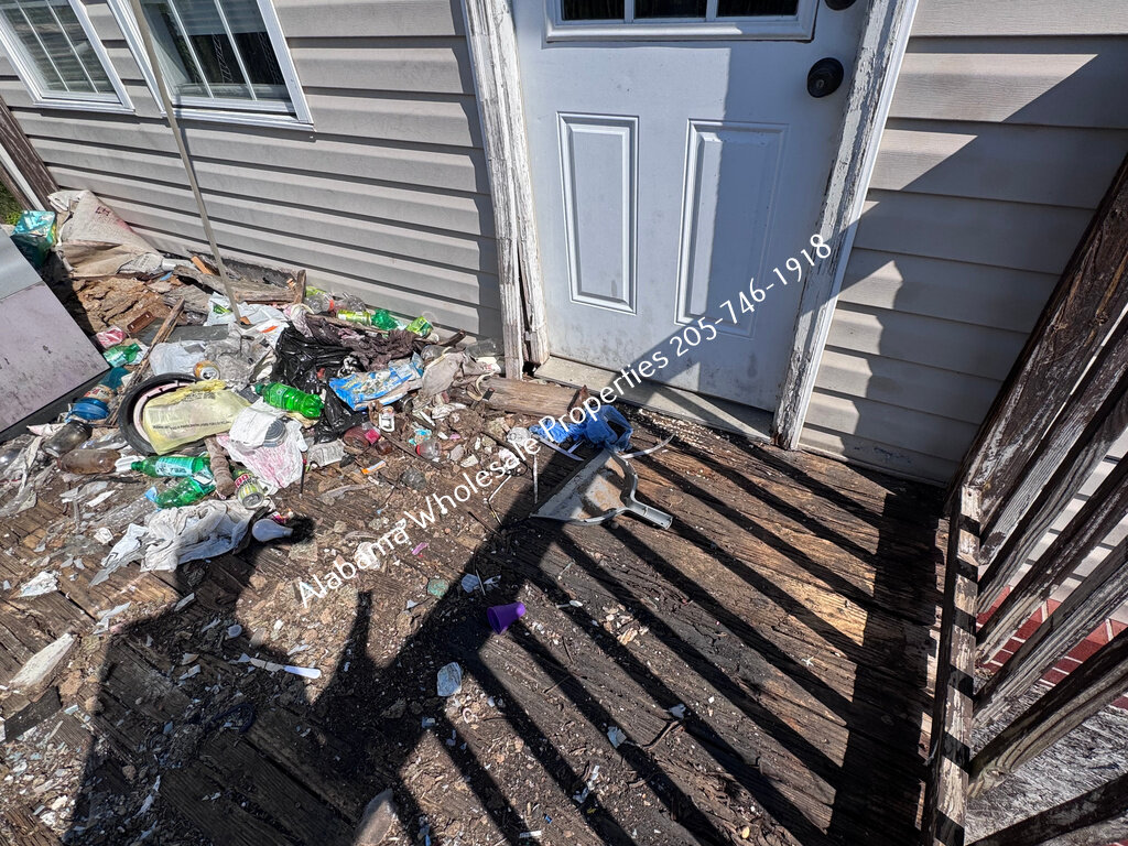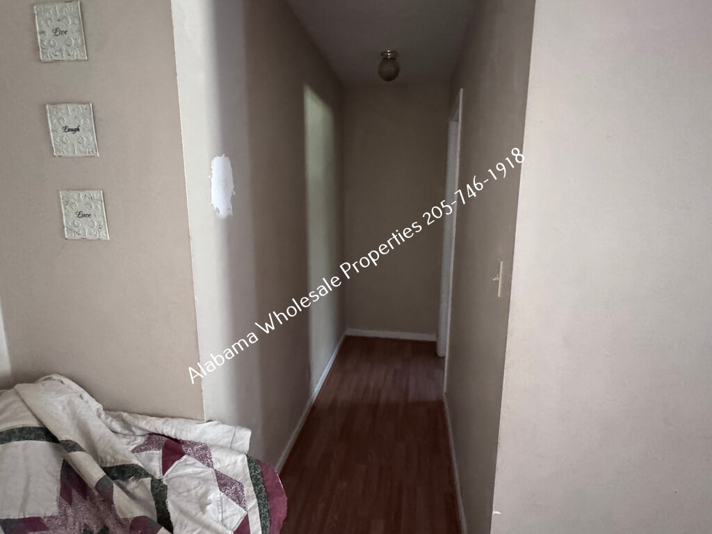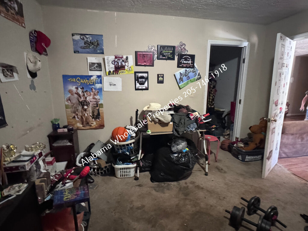 The home will need interior paint and flooring throughout. There is a stack of flooring material on-site, though it’s unclear if it’s enough to complete the entire house. Some subfloor repairs will be necessary. Bathrooms need updating, and the kitchen will require appliances and cabinet painting.