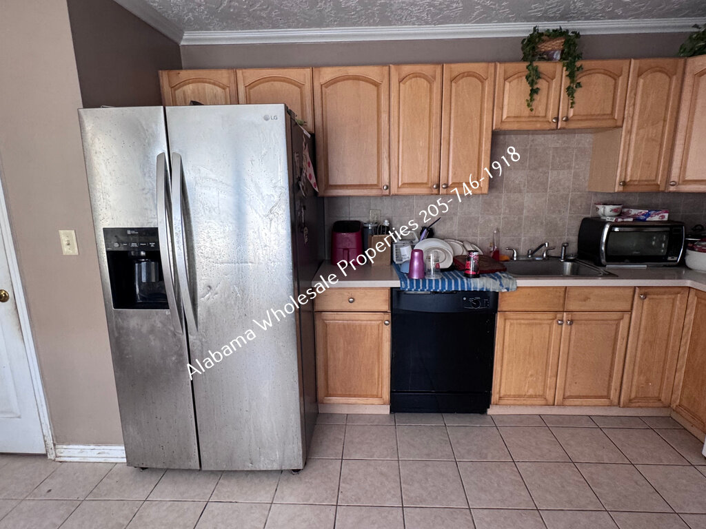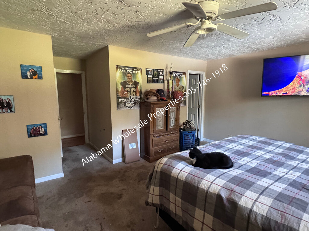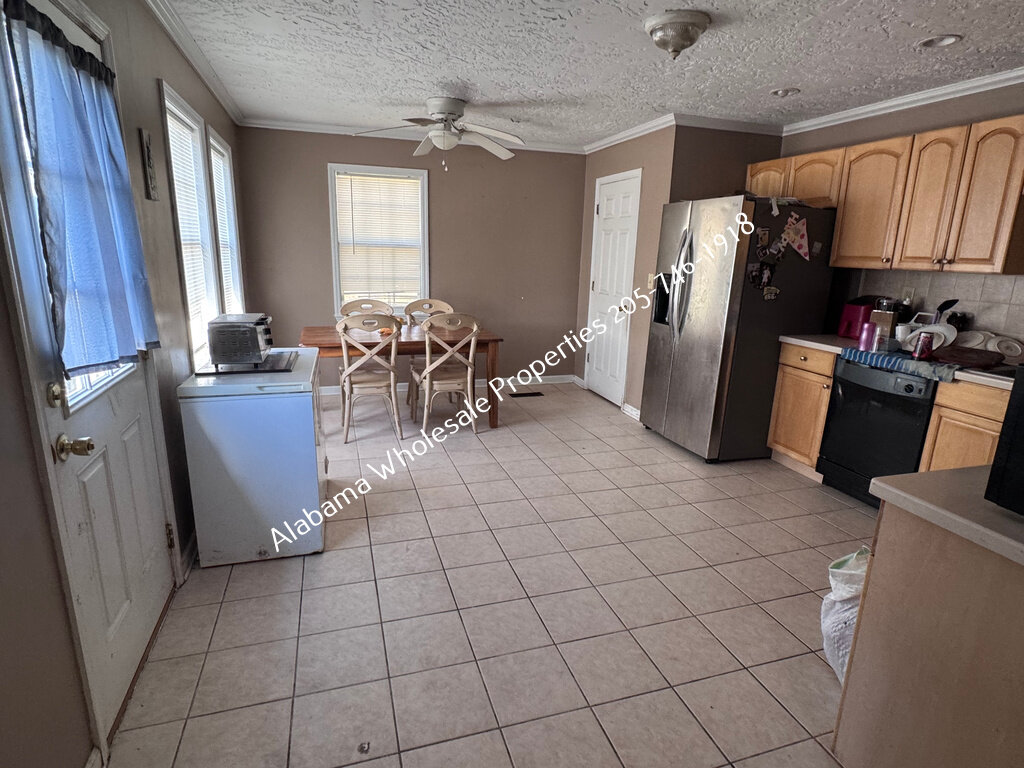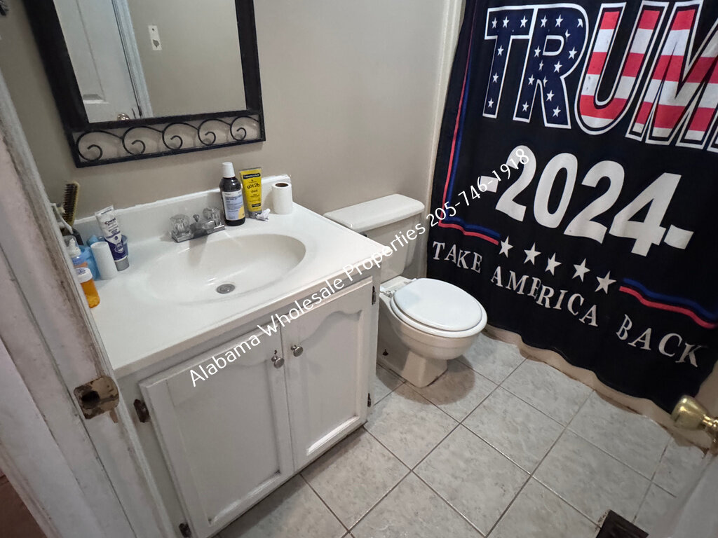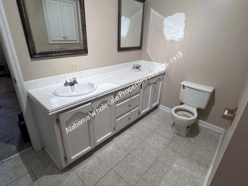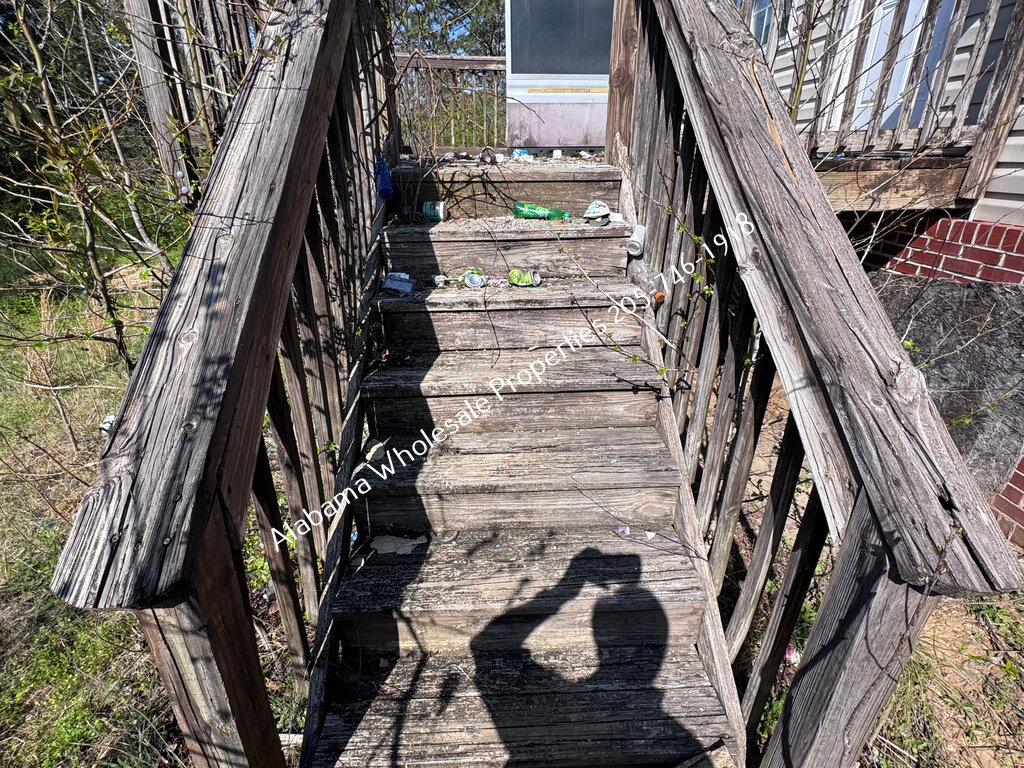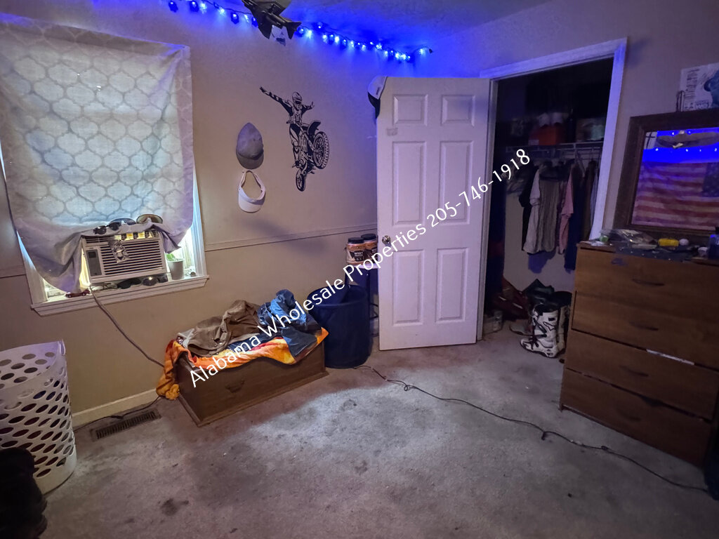 The home will need interior paint and flooring throughout. There is a stack of flooring material on-site, though it’s unclear if it’s enough to complete the entire house. Some subfloor repairs will be necessary. Bathrooms need updating, and the kitchen will require appliances and cabinet painting.