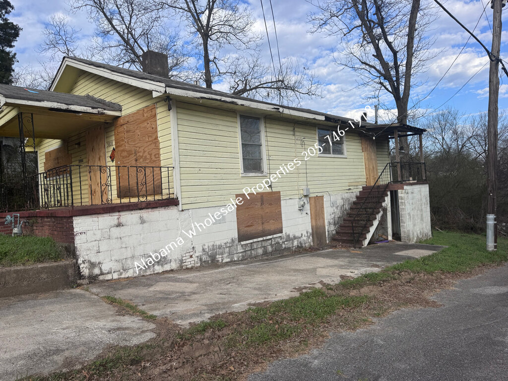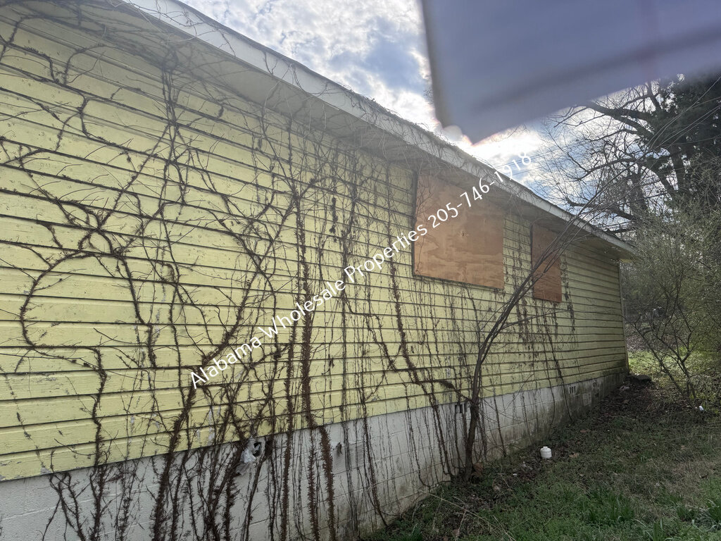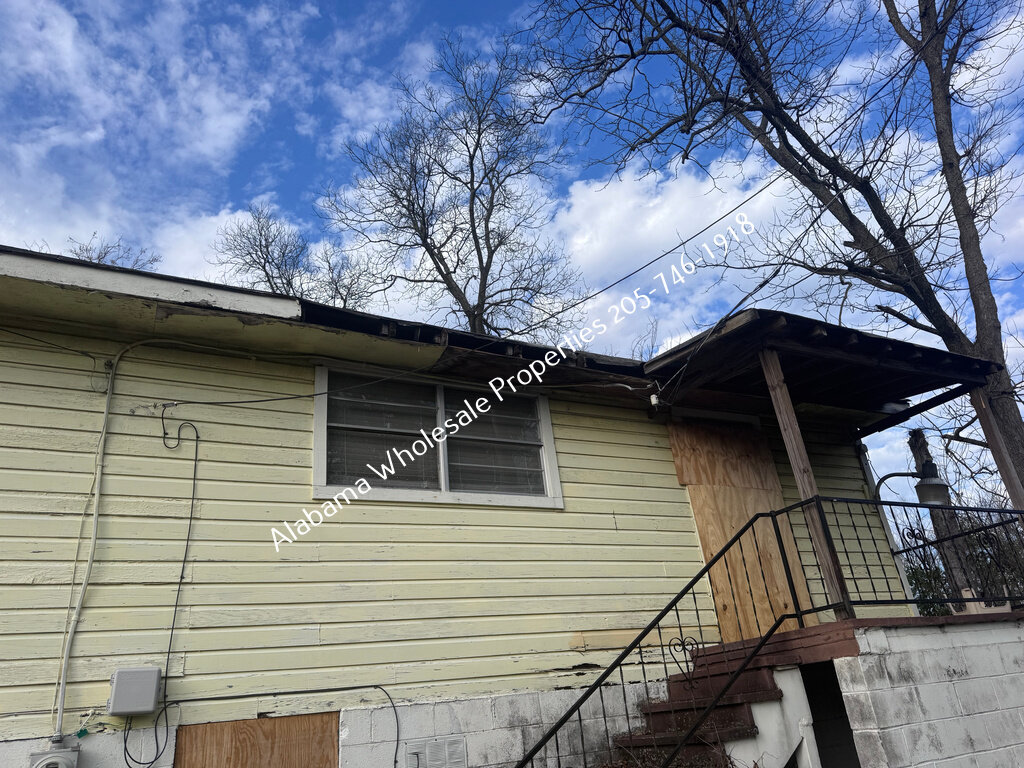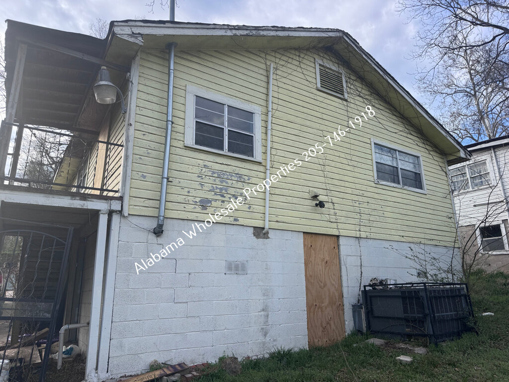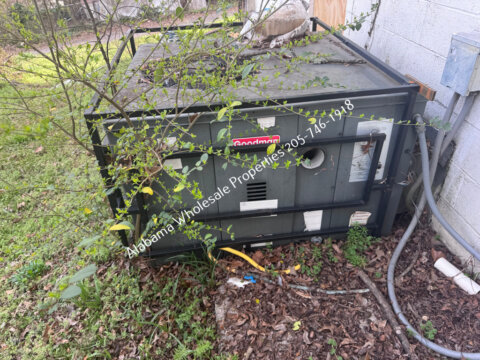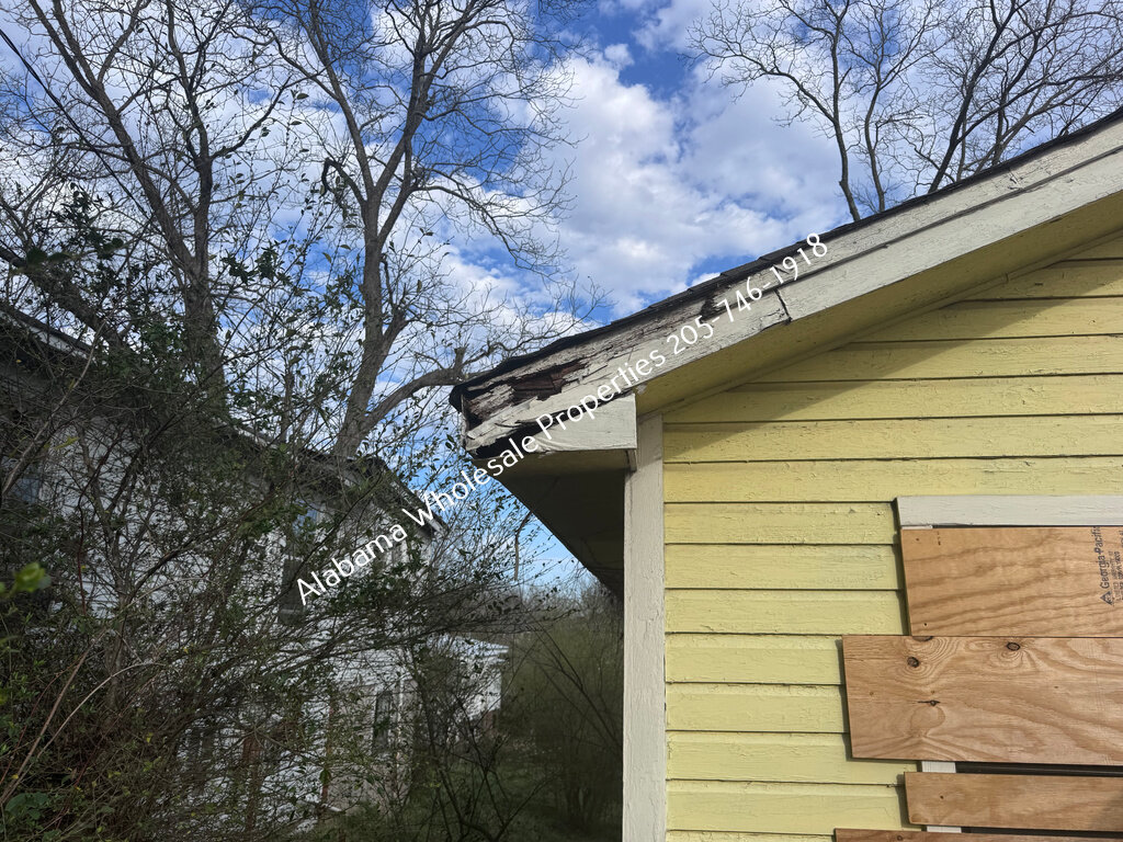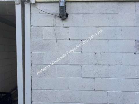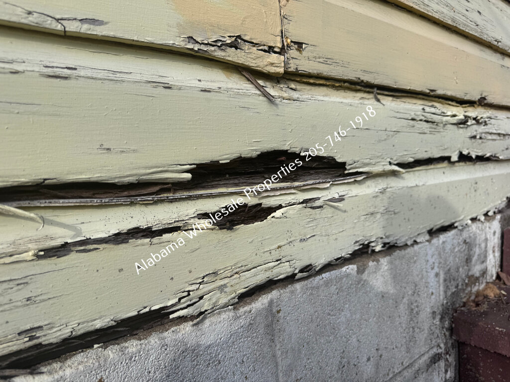 Exterior needs a new roof and HVAC system, along with trim repairs, siding work, fresh paint, and repair to a visible block crack.